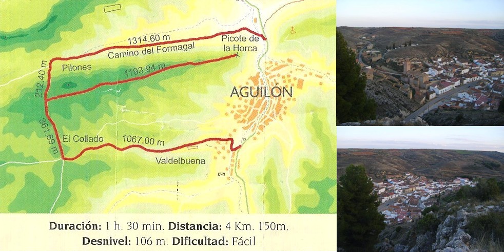 El inicio de la ruta se encuentra detrás del parque municipal, próximo a las barbacoas, la fuente del Pino y la de Triburcio, que dan acceso al camino que se dirige al embalse dé las Torcas. Iniciaremos la excursión por este camino, donde encontraremos un panel explicativo del recorrido, y a poco más de 1 km tomaremos un desvío a la derecha por la zona conocida con el nombre de El Collado. En menos de 400 metros nos desviaremos dé nuevo a la derecha para dirigirnos hacia el Picote de la Horca; punto situado a 770 metros sobre el nivel del mar, desde el que se admira una sorprendente panorámica del municipio, divisando el casco urbano de Aguilón y lugares tan emblemáticos como la "Peña Emborrachada", la ermita de Santa Cristina y la espléndida torre mudéjar.